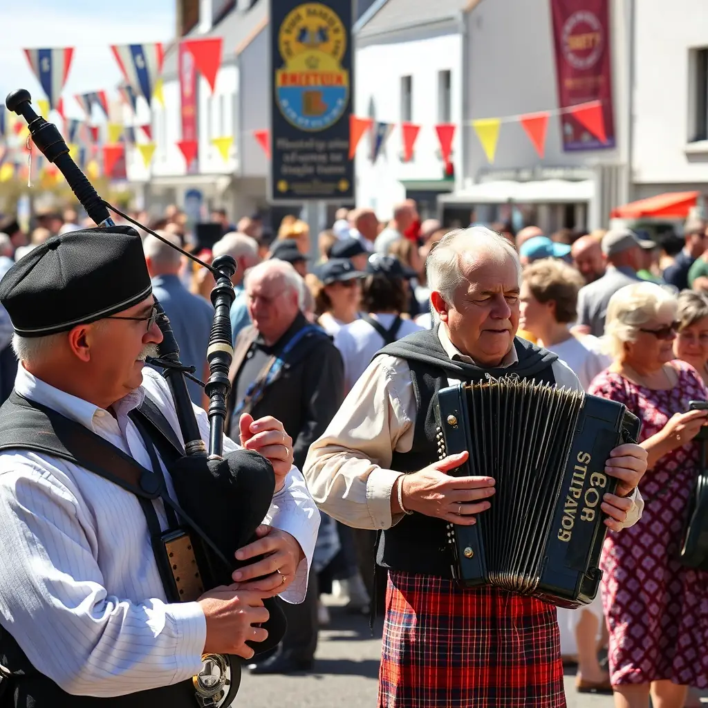 A detailed digital illustration showcasing a traditional Breton dance performance, with musicians playing traditional instruments in the background. The scene is vibrant and captures the energy of Breton culture.